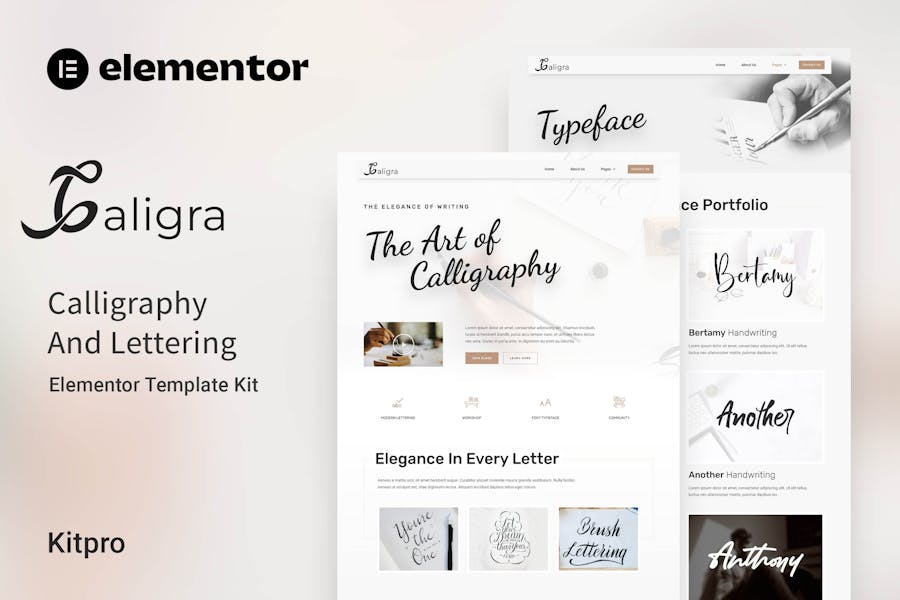 Caligra is an Elementor Template Kit for quickly and easily creating websites for your lettering, design or foundry business using the Elementor Page Builder plugin for WordPress.This is not a WordPress theme. Template Kits contain page content for Elementor page builder. This kit has been optimized for use with the free Hello Elementor theme but may be used with most themes that support Elementor.TemplatesPlugins installed with kit, Caligra – Calligraphy & Lettering Elementor Template Kit