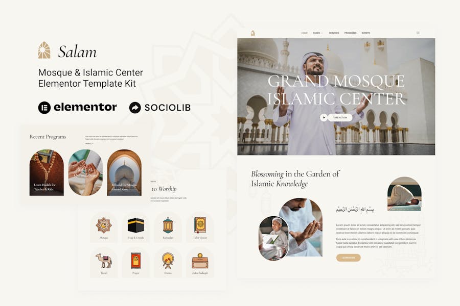 Salam is an Elementor Template Kit for quickly and easily creating Mosque & Islamic Center website using the Elementor Page Builder plugin for WordPress. Suitable for Mosque, Religion, Islamic Center, Non Profit, Organization, Worship, Masjid, Imam, Quran, Community, Festival, Events, Library, etc. Style your wordpress website with this creative and modern webdesign style template kit to bring a modern feel to your blog.This is not a WordPress theme. Template Kits contain page content for Elementor page builder. This kit has been optimized for use with the free Hello Elementor theme but may be used with most themes that support Elementor.Features:Templates:, Salam – Mosque & Islamic Center Elementor Template Kit