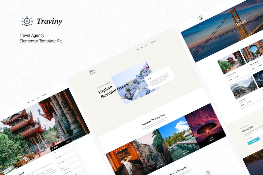 Building a travel agency website can be a difficult and challenging task. Specially when it comes to the layout, elements and visual style. Traviny is an Elementor Template Kit for travel agencies, vacations, city break or trips websites. Includes all the important inner pages such as Tours, Destinations, About, Contact etc. Traviny comes with a Header, Footer and Booking form built with included plugins, so Elementor Pro is not required., Traviny | Travel Agency Elementor Template Kit