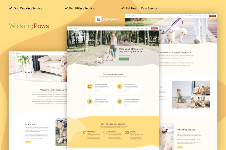 Walking Paws is an Elementor Template Kits build for dog walking and pet care service business. The template is pixel-perfect well designed and makes sure you can create your website without touching a line of code. Especially designed and tailored for pet care services, you will find all the essential features to make your website a success., Walking Paws – Dog Walking and Pet Services Elementor Template Kit