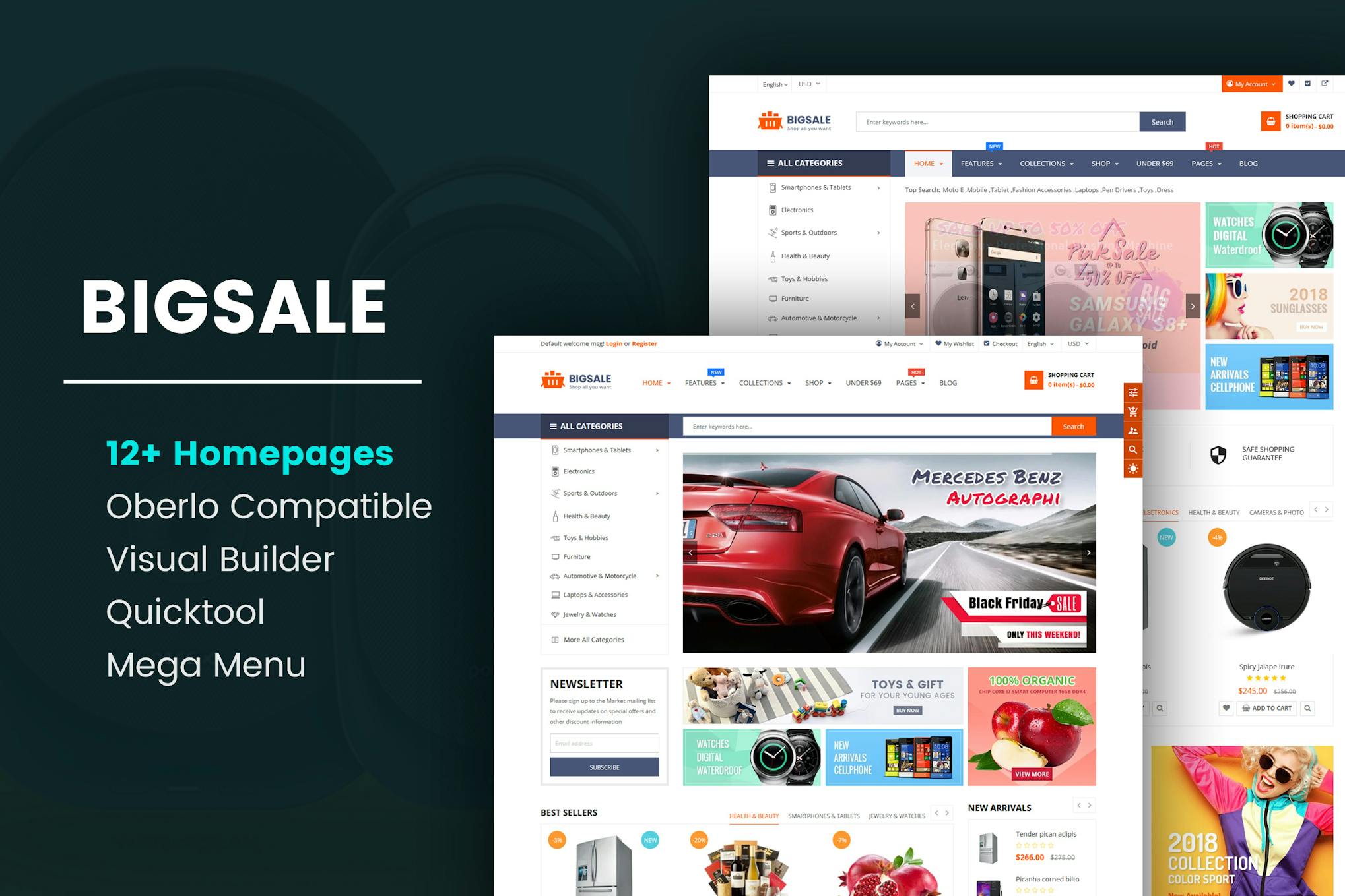 **BIGSALE – MULTIPURPOSE BOOTSTRAP 4 SHOPIFY THEME – SECTIONS READY!** **BigSale** is responsive, easy to use and highly customizable **Shopify theme**. Theme is designed with multi-homepages and rich features for fashion, supermarket, electronics, cosmetics, furnitures or any store BigSale comes with plenty of creative options and useful features such as: **Eye-catching Homepage Slider, Advertising & Newsletter Popup, Powerful Mega Menu, Visual Page Builder, Ajax Cart, Ajax layer Navigation, Quick View product, Product Brands, Instagram Gallery, Quick Tools, Social Share.. and so on.** Thanks to visual and drag-n-drop website builder, you easily modify and create any website you want without any coding by redesigning any of the pre-built content that makes up this Shopify Theme. **Core Features:** + Bootstrap 4 Based + Include Google’s Rich Product Snippets for Better SEO + Responsive Shopify theme + Built with CSS 3 + HTML 5 + Google Web Fonts Integration + Mega Menu + Ajax Layered Navigation + Lazy Loading Image + Display payment options + Variant Image + Product Image Size Settings + Ajax Layeredl Navigation + Color Swatches Ready + Custom logo, favicon upload easily + Custom product per page and product per row + Simply to Use & Variant Color Options in Admin Backend + Newsletter Signup Popup with Mailchimp Support + Custom Tabs (Horizontal & Vertical) in Product Page + Flexslider Image Slideshow Module + Dropdown Shopping Cart + Ajax Add to Cart + Product Label + GRID & LIST Mode + Hover Effect for Product Images + Zoom Box & Lightbox Effect in Product Page + Product Reviews + Related Products + Shipping Calculator in the Cart page + Multiple Currencies + Blog Page Design + Custom Contact Page + SEO Optimized + Compatible with IE10+, Firefox, Netscape, Safari, Opera 9.5 and Chrome _This design also is available in OpenCart – BigSale OpenCart Theme_, BigSale – Unlimited Bootstrap 4 Shopify Theme BigSale – The Clean, Minimal & Unlimited Bootstrap 4 Shopify Theme (12+ HomePages)