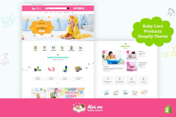 **Mini-me** is a smart and interesting Shopify theme designed for online stores selling toys, kids clothing, and baby belongings. With an eye-catching design created with awe-inspiring baby colors such as pink, yellow, green, blue… this theme will be an excellent choice for the building kids websites. As well as, the colorful banners and doodles give the entire layout a sumptuous look. Similarly, the enlarge slideshow designed with pretty kids pictures, comely text, and lovable animations surely make your viewer’s eyes standby on your website for a large time. Following, the daily deal module exposes the newly launching products with nice short description, discount price and countdown time. Not only that, the charming blog will surely act as the best bridge between customers and shopkeepers to communicate with each other. Just make a look over on the promo page you can find more exciting features regarding the theme **KEY FEATURES OF MINI ME THEME** + Responsive Design- Looks great on desktops, laptops, tablets and mobiles. Give it a try on your iPhone or iPad now. + Slick Slider- This slider displays your content the beautiful way. Whether it’s a Slider, Carousel, Hero Scene. + Products Featured Slider + Product Sale Label + Product Carousel: Option to showcase products as carousel. + Compare Products: This feature enable to compare more than one item at a time Product sorting on collection pages: Sort by price, A to Z, newest etc. + Grid & List Mode + Customer Reviews + Customer accounts: Customers can register, login, change addresses and view past orders. + Product Owl Carousel + 5 types of Mega Menu + Ajax filters: Filter products by colors and other parameters using tags. + Ajax Cart: An option to purchase the items without leaving current page. + Ajax Wishlist: An option keep your items in Wishlist. + Custom Information Widget + Custom About us + Contact page + Drag & Drop sections: Option to change the home page layout order using Drag & Drop option. + Highly customizable: Change colors, fonts, background image through the theme settings. No coding required. + Multi-currency: The currencies AUD,CAD,USD,GBP,JPY,EUR,NZD,INR,PHP are inbuilt with theme + Great for SEO: Uses the latest Shopify SEO features and product data is formatted for Google rich snippet, so that product listings are optimized for search engines. + Branded checkout: A seamless checkout for your customers using your logo and color scheme. You can also add a custom checkout header to your checkout screens! + Newsletter: Easily link your Mailchimp account to the newsletter form. + Social Sharing: Share by Twitter, Facebook, Google+ and Pinterest., Mini Me – Baby, Kids Care Products Shopify Theme Baby, Infant Health Care Products! Shampoo, Tooth Brush, Diapers, Toys, Water Bottles, Soaps etc.,