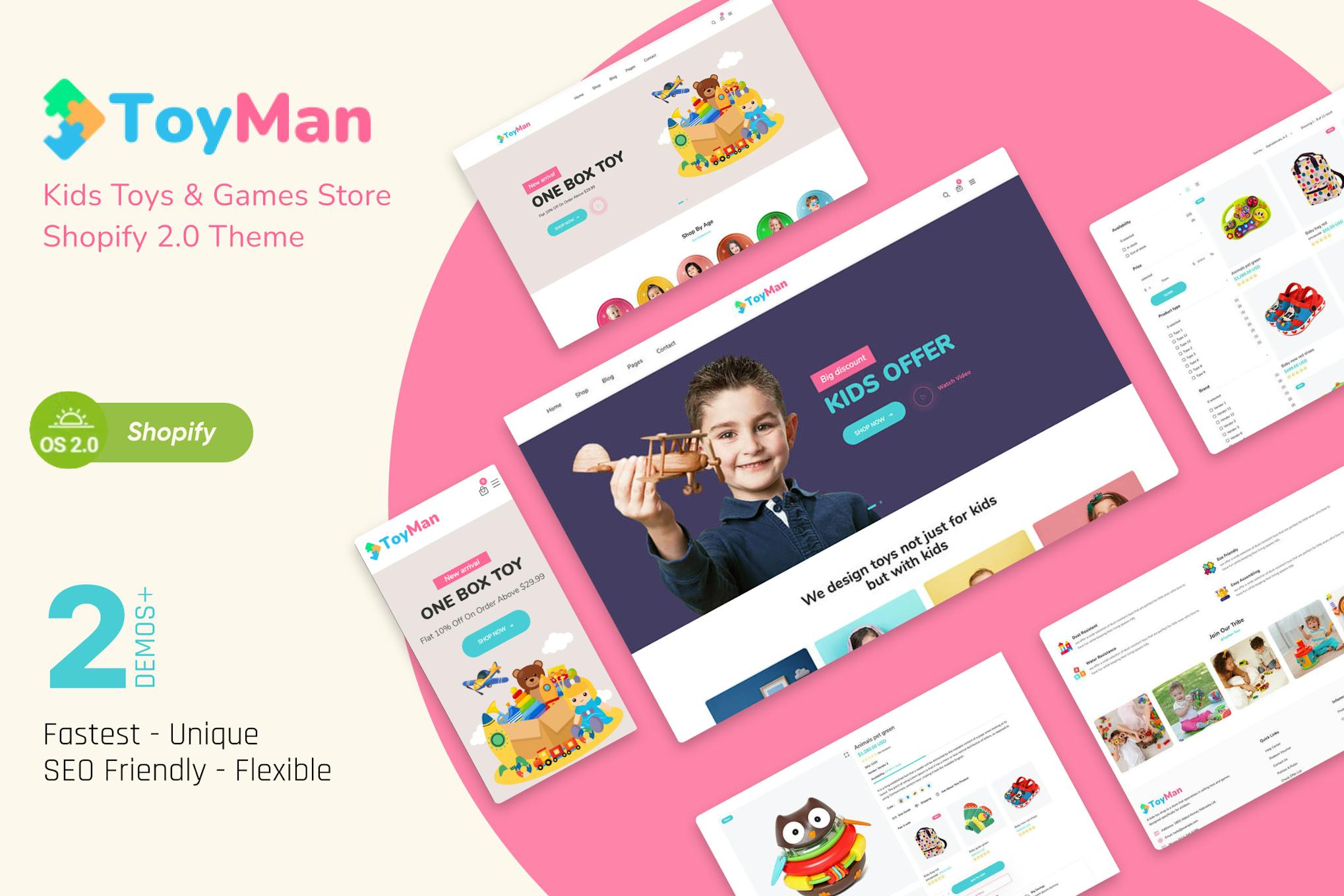 ToyMan is an attractive and flexible Multipurpose Shopify theme built specifically for kids’ fashion boutiques, gift shops, baby clothing shops, toys, and baby products online stores – you can sell kids’ clothes and toys, as well as create a children-oriented blog or portal with a store section. that would easily fit into your new or existing online store. Baby clothes, kids’ toys, infant products, strollers, children’s books and creativity products, amusement park certificates, Mothercare, and nursing products for infants and newborn children – all these can be beautifully presented and sold via your website. ToyMan is blended together with exclusive kids-friendly fonts and graphics that would reflect what kids love. The theme creates a joyful mood for your customers to buy items from your website. It has cross-browser compatibility and friendliness with Mobile devices. **TOYMAN– BEST SHOPIFY THEME FOR TOY STORES AND KIDS** **Full Features List** + Quick Install+ + Online Store 2.0 Integrated+ + Sections on every page+ + Add a Section on every page+ + Sections drag and drop on every page+ + Theme app extensions with app blocks+ + Supports Shopify’s latest technology+ + Quick Demo Install+ + Announcement Bar+ + Header (5 styles)+ + Top Bar+ + Dropdown Menu+ + Mega Menu+ + Search Field+ + User Menu+ + Multiple Currency+ + Mini Cart Drawer+ + Hero Sections+ + Slideshow+ + Slideshow + Category Menu+ + Hero Banner (2 styles)+ + Banner Sections+ + Countdown Banner+ + Multiple Banner+ + Popup Video Banner+ + Collection Sections+ + Featured Collection+ + Featured Collection List+ + Tab with Product+ + Category List+ + Multiple Collection List+ + About Sections+ + About with Contact+ + About with Image+ + About Service+ + Brand Logo+ + Our Journey+ + Team Member+ + Team Skill+ + Testimonial+ + Call to Action+ + Newsletter Subscription+ + Blog Sections+ + Latest Blog (2 styles)+ + Contact Sections+ + Contact Form+ + Contact Info (2 styles)+ + Google Map+ + Location Map+ + FAQ Section+ + Product Options+ + Quickview+ + Add to Cart (Popup, Spin, Click to the cart page)+ + Wishlist+ + Compare+ + Badge (New, Sale, Soldout)+ + Collection All Page+ + Storefront filtering+ + Let Sidebar+ + Right Sidebar+ + Price Filter+ + Sorting+ + Grid/List View+ + Collection List Page+ + Product Details Page+ + Product Media+ + Product Zoom+ + Product Image Popup+ + Ajax Product Inventory+ + Product Variants (Swatch, Select Option)+ + Dynamic Checkout Button+ + Product Share+ + Secure Payment Gateway Badge+ + Product Information Tab+ + Related Product+ + About Page+ + Service Page+ + Contact Page+ + Search Page+ + FAQ Page+ + Wishlist Page+ + Default Blog Page+ + Service Blog Page+ + Default Blog Details Page+ + Service Blog Details Page+ + Cart Page+ + Shipping Calculator+ + Cart Note+ + Footer+ + About+ + Blog+ + Contact Infos+ + Menu+ + Newsletter+ + Copyright+ + Breadcrumb+ + Typography+ + Multiple Color Option+ + Newsletter Popup+ + Preloader+ + Section Padding/Margin/Background Option+ + Back to top+ + Fully Responsive+ + Cross Browser Compatibility+ + Password / Coming Soon Page + THE DOWNLOADABLE FILE DOES NOT CONTAIN ANY IMAGES. IMAGES IN THE THEME ARE ONLY FOR DEMO PURPOSES., ToyMan – Kids Toys & Baby Store Shopify 2.0 Theme Kids Toys & Baby Store Shopify 2.0 Theme